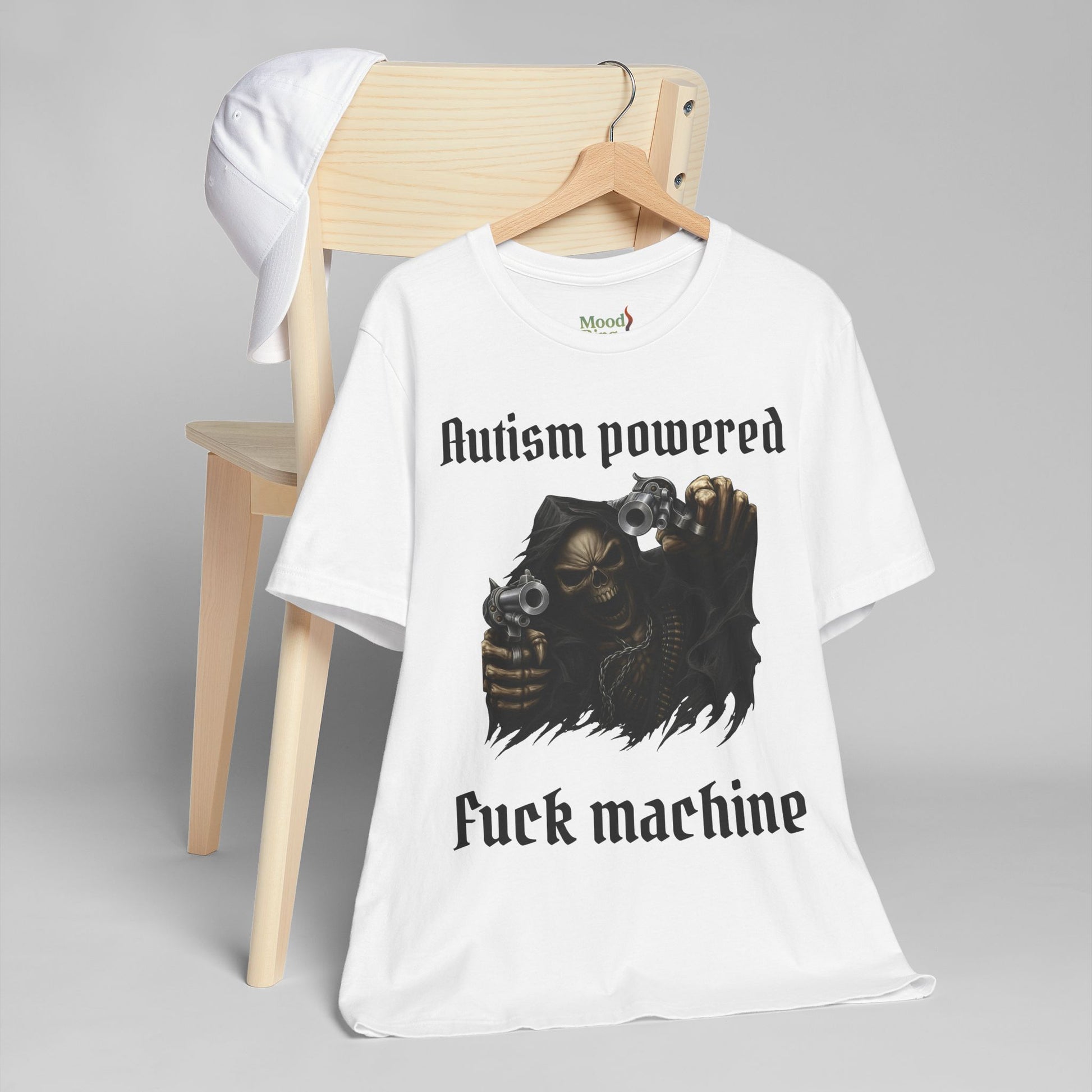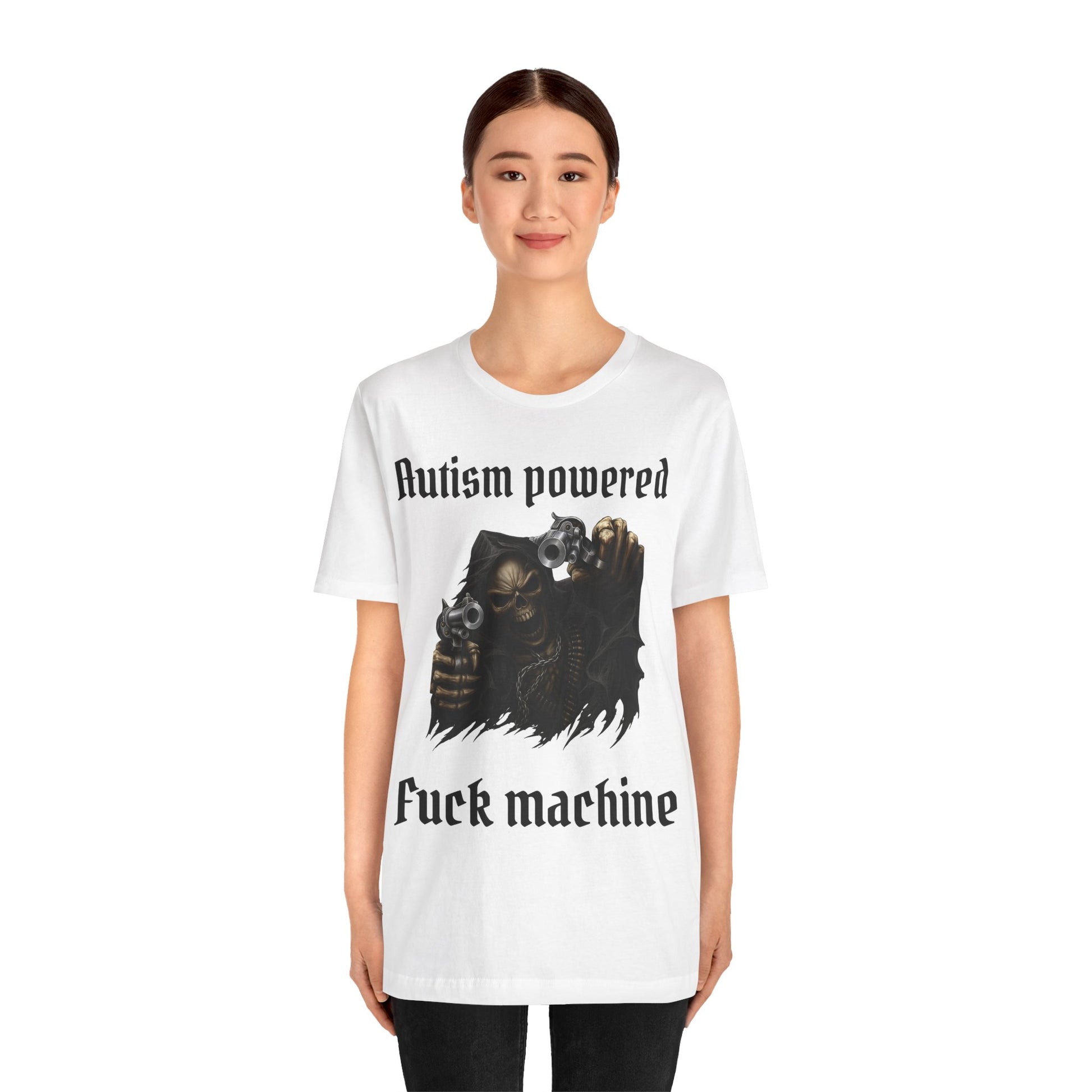 Unleash chaotic energy with this “Autism Powered Fuck Machine” tee. Featuring a grim reaper–style skeleton dual-wielding pistols, this shirt fuses dark metal aesthetics with meme-driven rebellion. Made for the unapologetic and unfiltered, it’s bold, loud, and impossible to ignore—a perfect fit for anyone who thrives on shock humor and raw self-expression.